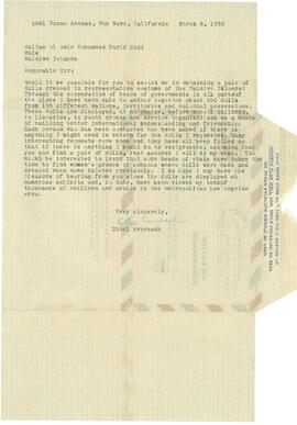 1958މ މާރޗް 6(1377ހ ޝައުބާން 15)ގާ، އައްސުލްތާނު މުހައްމަދު ފަރީދު ދީދީއަށް، އެތެލް އެވާބެކް، އޭނާޔަކީ، އެކިއެކި ގައުމުތަކުގެ ސަގާފީ ހެދުމުގާ ތިބޭ ބުދު(ކުޅޭކުޅޭ) އެއްކުރާ ކަމާއި، އޭނާގެ 'ކަލެކްޝަނު'ގާ 128ގައުމުގެ ގާތްގަނޑަކަށް 550ބުދު ހުރި ކަމާއި، ސްކޫލް ކުދިންނަށާ، ޒުވާނުންގެ ޖަމިއްޔާތަކަށާ، އެފަދަ އެކިއެކި ތަންތަނުގާ އޭނާ އެއެއްޗެތި ހިލޭ ދައްކާދޭނެ ކަމުގާ ބުނެ، އޭނާޔަށް ދިވެހި ރާއްޖޭންވެސް އެފަދަ 2 ބުދު ލިބޭތޯ އެދި، ފޮނުވާފާވާ ސިޓީއެއް. Letter sent by Ethel Averbach- a doll collector from California- to Sultan Mohamed Fareed Didi on March 6- 1958- requesting for two dolls from the Maldives (Size: 8" X 6") America - letter (Foriegn)