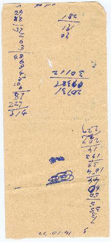 14.10.72މ(6.9.1392ހ) މަތީގާ ޖަހާ، ހަދާފާވާ ހިސާބުތަކެއްގެ ކަރުދާހެއް. Note with mathematical calculations (Size: 6.35" X 2.8")