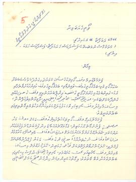 1373ހ ސަފަރު 15(1953 އޮކްޓޯބަރު 23)ގާ، ވުޒާރަތުލް ދާހިލިއްޔާ އިން؛ 1370ހ ޒުލްގައިދު 28(1951މ އޯގަސްޓް 31)ގާ ކަނޑައެޅުއްވި، ސަރުކާރުގެ ވަގުފްގޯތީގެ އާ ގަވައިދުގެދަށުން، ރިނބޫދޫ މޫސާ ހަތީބް ކަލޭގެ ދަރި ދޮންއަލީ ކަލޭގެ ވަގުފްކުރި މައްޗަންގޯޅި ކުންނާރު ގޯތީގެ ވަގުފް، ތ.އެލާއިން ނަގާ، ލާޖައްސާފާ، އެގޯތީގެ ހަވާލުވެރިކަން، 1218ހ ޒުލްގައިދު 12(1804މ ފެބްރުވަރީ 24)ގާ އަލްގާޒި މޫސާ މުހިޔިއްދީނު އުއްތަމަ ފަނޑިޔާރު މަނިކުފާނު ލިޔެދެއްވާފައިވާ ފަތުގާ އޮތްގޮތަށް، ރިނބުދޫ ދޮން އަލީ އަށާއި، އޭނާގެ އަނބިންނަށާއި، ހުރިހާދަރިންނާއި، ދަރިކޮޅަށް ލަށްވާ؛ ލިޔެދެއްވާފާވާ ފަތުގެ ނަކަލެއް. Size: 8.8" X 6.7" K.Male' - Ma.Kunnaaru Goathi (Housing Plot) - Deed for housing plot