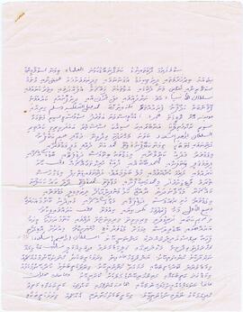 1079ހ(1668މ)ގާ،(ތާރީހި، ރަދުނަށް ބަލާފާ)، އައްސުލްތާނު އިބްރާހީމް އިސްކަންދަރު 1ގެ ރަސްކަމުގެ 21ވަނަ އަހަރު، އެރަދުން، އޭނާގެ ދަރި މަރިޔަމް ކަނބާފާނު، އެ ކަނބާފާނުގެ ދަރި މުހައްމަދުއަށް ދެއްވި ގަލީ ގަނޑުވަރާއި، އެތާގާވާހާ ސާމާނަކާއި، ބިމާއި، ރުއްގަހާއި، ދިޔަމިގިލީ 'ފަންފަނާއި'(ހީވަނީ – 'ތަންތަނާއި' ހެން) އަހުމަދު ބޭބެއާ ދެއަގެ؟(ދެބެންގެ؟) ހުރިހާ ތަކެއްޗެއް، ވަގުފްކުރެއްވުމަކީ ރަންގަޅު ކަމެއްކަމަށް ވިދާޅުވުމުން، އެ އެންމެހާ ތަކެތި ވަގުފްކުރަށްވާ، މަރިޔަމް ކަނބާއަށާ، އޭނާގެ ދަރިކޮޅަށް ހަވާލުވެރިކަން ލަށްވާ، އަބަދުވެސް އެ ގަނޑުވަރު އެގޮތަށް ބޭއްވުމަށާ، އެރަށު މީހުންގެ އޮޑިދޯނީގާ 'ރިއްސެއުދިދަ'(ރީނދޫ ދިދަ؟؟؟ރަސްދިދަ؟) ނެގުމުގެ ހުއްދަދެއްވާ، އެރަދުންގެ ދަރި(މުހައްމަދު މަނިކުފާނު ގިޔާސުއްދީނު؟)އަށާ، ގަލީ ގަނޑުވަރުގެ މައްޗަށް ދިއަމިގިލީން ހަތީބަކު(ކަތީބަކު)ކަނޑައަޅުއްވާ، އެތަން އަމާނާތެއްގެ ގޮތުގާ، ބަލެހެށްޓުމަށް އޭނާޔަށް، ހަވާލުކުރަށްވާ، އިހުއްސުރެ އޮތް އާދައިގެ މަތިން، އެރަށު ކަތީބަކަށް އޮންނަ ކޮންމެ ކަމެއް، އެގަނޑުވަރުގެ ހަވާލުވެރިޔަކަށް އޮންނަންވާނެ ކަމާއި، ދުއާ، މާލޫދު، ސޮލަވާތްފާތިހާ، ކަށުކަމާކެމީގެ ކަންކަމާއި، މިފަދަ ޖަމާއަތީ ކަންކަން، އޭނާ ކުރާނަމަ، އެކަމުގެ އުޖޫރަ ދޭންވާނެކަމާ، އަދި އެރަށު ކޮންމެ ދޯންޏަކުން، އެގަނޑުވަރަށް 10 މަސްބައި، އަދި އެރަށުގެ ކޮންމެ ރާވެރިއަކުވެސް އެކަތީބުންނަށް ބައިއަޅަންޖެހޭނެ ކަމާ، އެ ގަނޑުވަރުން ކެއުމާއި ބުއިންވެސް ކަތީބުންނަށް ހުންނަންވާނެ ކަމާ، އެމީހުންނަށް ވާރު އިސްތިސްނާވާނެ ކަމާ، މިކަންކަމުގެ އަމުރުނެރުއްވުމުން، އެރަދުންގެ ސިއްކަޖަހާ، ފެންފުށީ މުދިން އަހުމަދު ލިޔެދފާވާ ދިވެސްއަކުރު ފަތުގެ، 1962 އޭޕްރިލް 1(1381ހ ޝައްވާލް 25)ގާ، ފޮރި ހަސަން ދީދީ ކޮށްފާވާ ތާނަ ތަރުޖަމާއެއް. Size: 11" X 8.5" Th.Dhiyamin'gili - Galee Palace - Deed for housing plot- Endowment for property